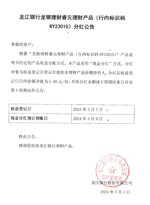 关于龙银理财睿元理财产品(行内标识码RY23010)分红公告