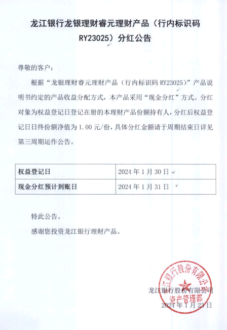 龙江银行龙银理财睿元理财产品(行内标识码RY23025)分红公告
