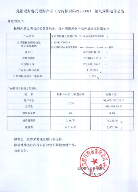 龙银理财睿元理财产品(行内标识码RY23008)第九周期运作公告