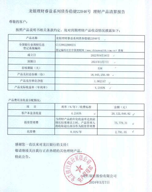 龙银理财睿益系列债券稳健22046号理财产品清算报告