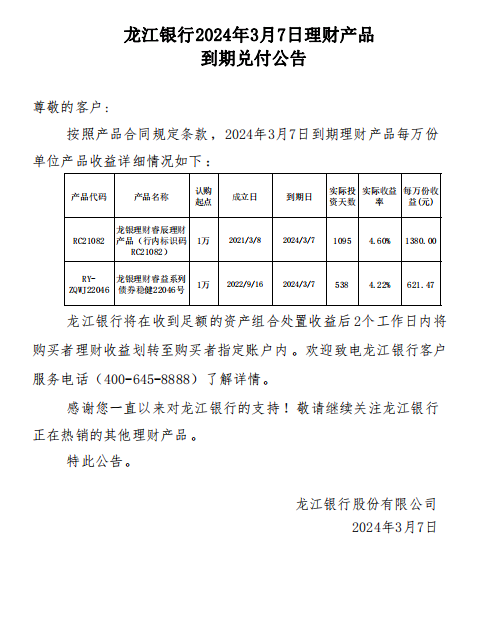龙江银行2024年3月7日理财产品到期兑付公告