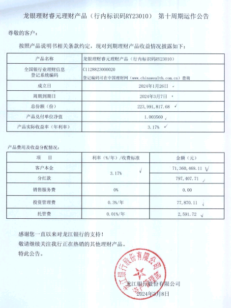 龙银理财睿元理财产品(行内标识码RY23010)第十周期运作公告
