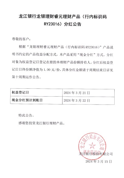 龙银理财睿元理财产品(行内标识码RY23016)分红公告