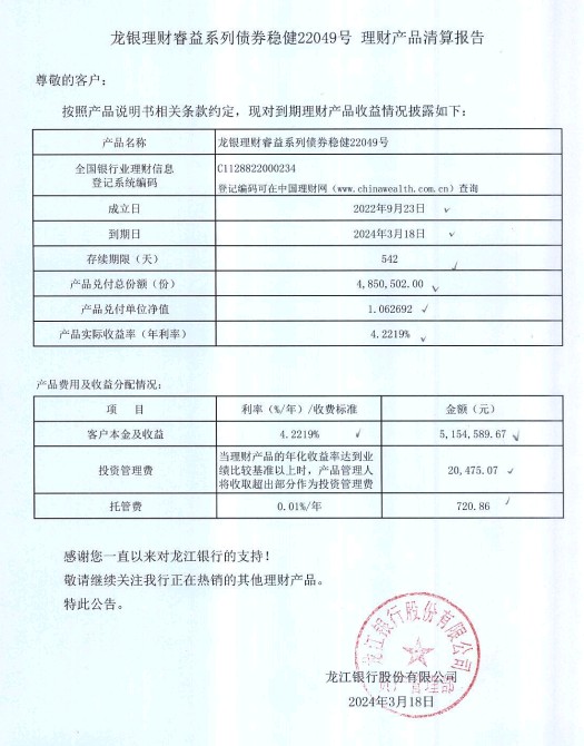 龙银理财睿益系列债券稳健22049号理财产品清算报告
