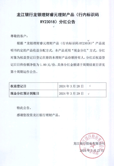 龙江银行龙银理财睿元理财产品(行内标识码RY23018)分红公告