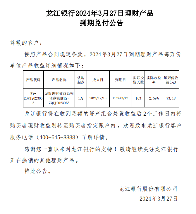 附件:龙江银行2024年3月27日理财产品到期兑付公告