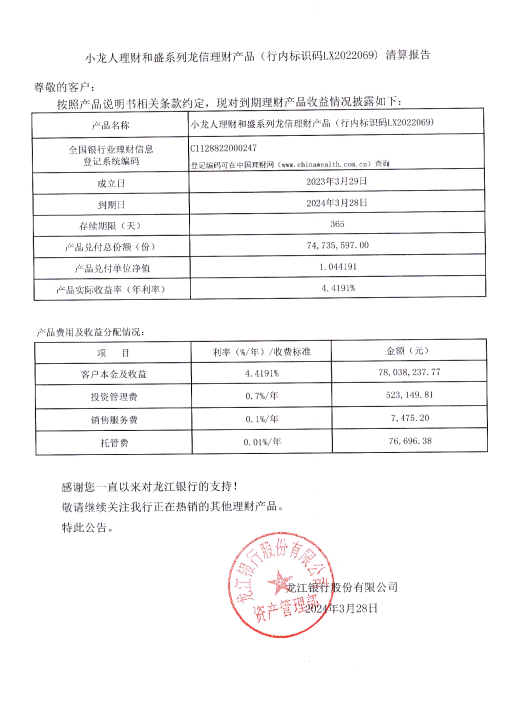 小龙人理财和盛系列龙信理财产品(行内标识码LX2022069)清算报告