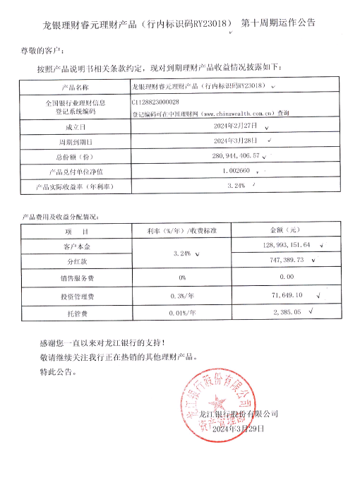 龙银理财睿元理财产品(行内标识码RY23018)第十周期运作公告