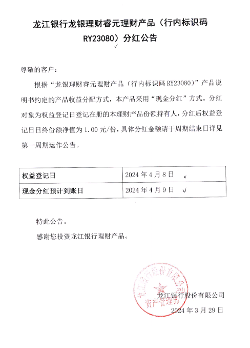 龙银理财睿元理财产品(行内标识码RY23080)分红公告