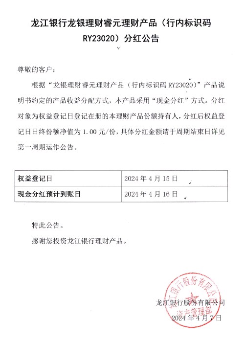 龙江银行龙银理财睿元理财产品(行内标识码RY23020)分红公告