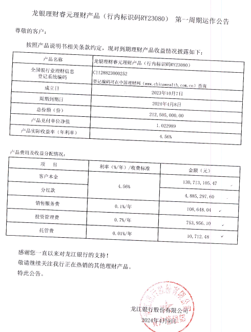 龙银理财睿元理财产品(行内标识码RY23080)第一周期运作公告