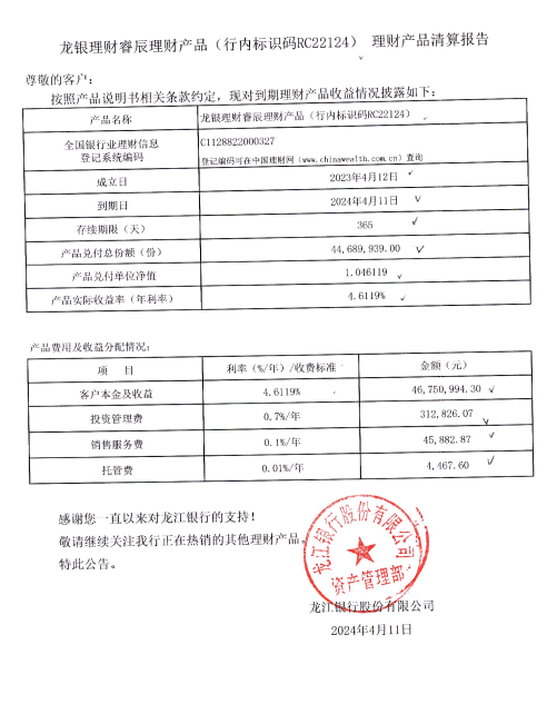 龙银理财睿辰理财产品(行内标识码RC22124)理财产品清算报告