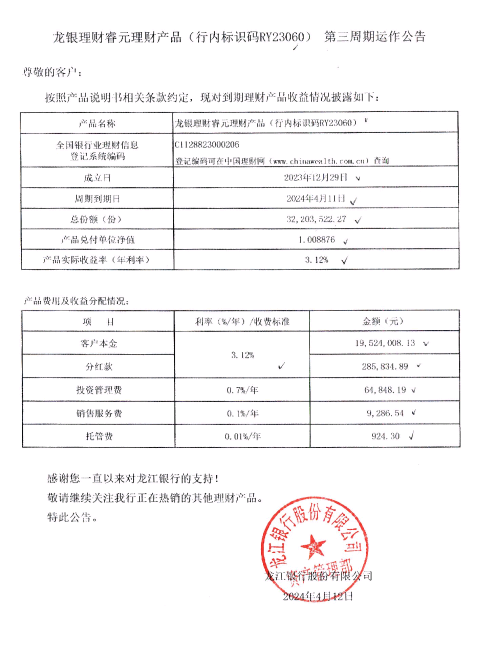 龙银理财睿元理财产品(行内标识码RY23060)第三周期运作公告