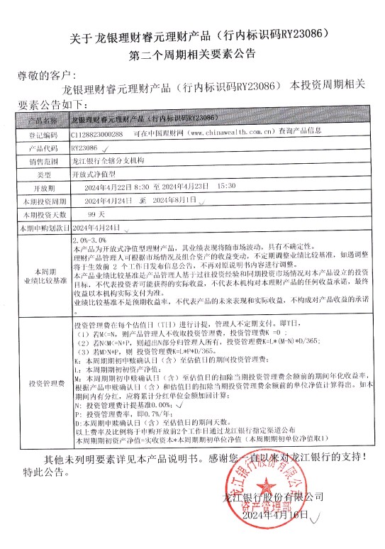 龙银理财睿元理财产品(行内标识码RY23086)第二个周期相关要素公告