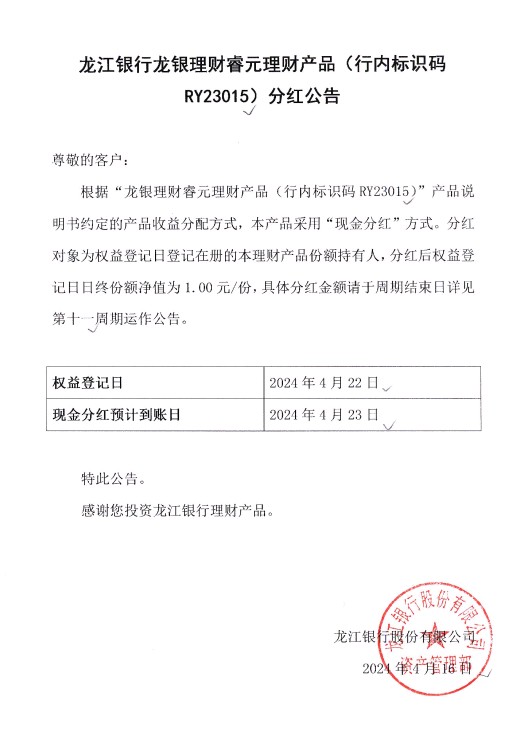 龙江银行龙银理财睿元理财产品(行内标识码RY23015)分红公告