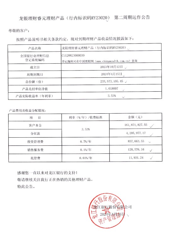 龙银理财睿元理财产品(行内标识码RY23020)第二周期运作公告