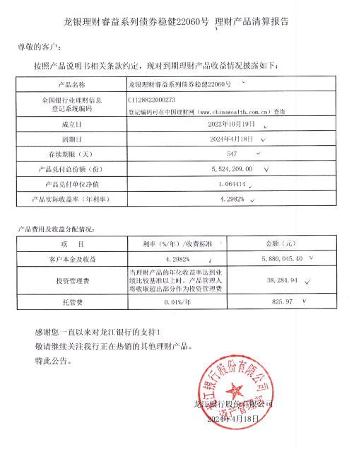 龙银理财睿益系列债券稳健22060号理财产品清算报告