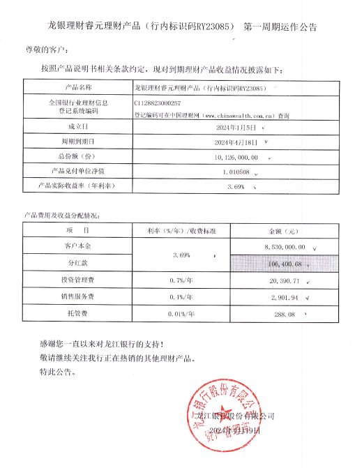 龙银理财睿元理财产品(行内标识码RY23085)第一周期运作公告