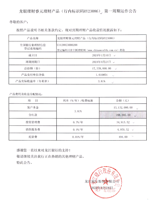 龙银理财睿元理财产品(行内标识码RY23086)第一周期运作公告