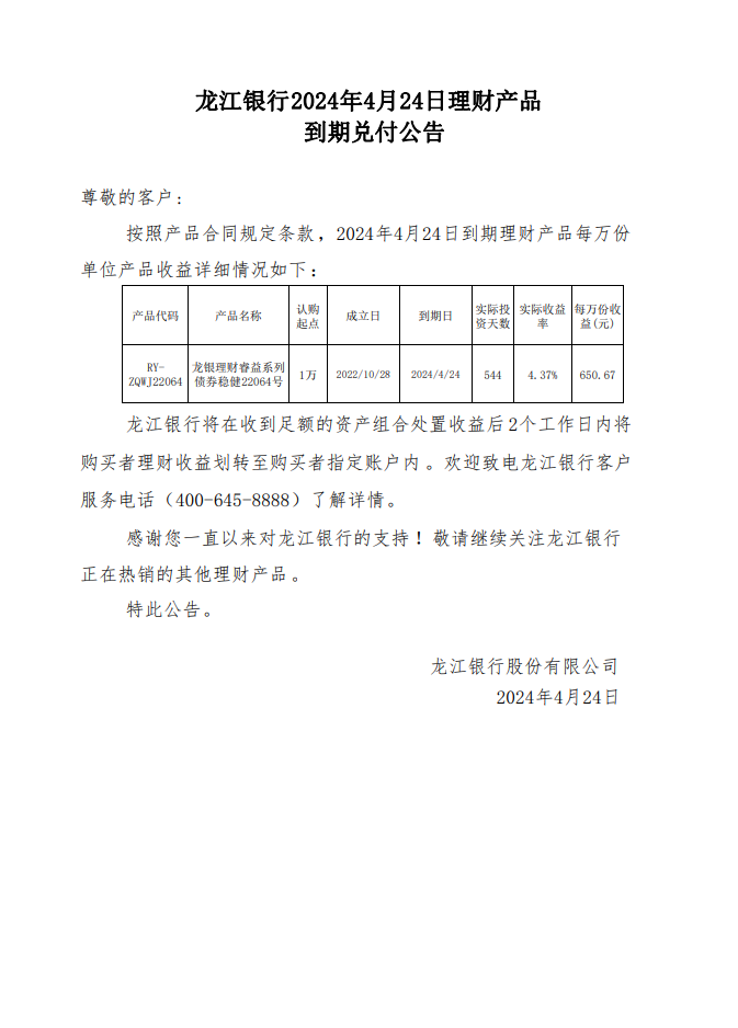 龙江银行2024年4月24日理财产品到期兑付公告