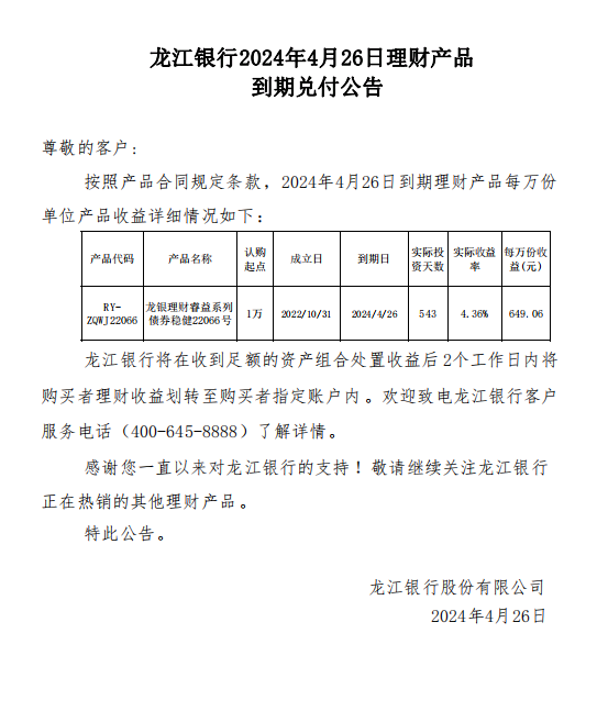 龙江银行2024年4月26日理财产品到期兑付公告