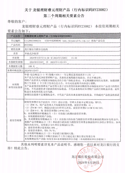 龙银理财睿元理财产品(行内标识码RY23082)第二个周期相关要素公告