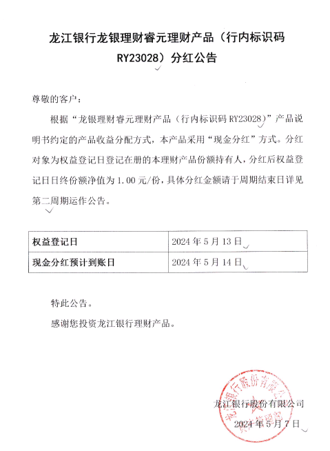 龙江银行龙银理财睿元理财产品(行内标识码RY23028)分红公告