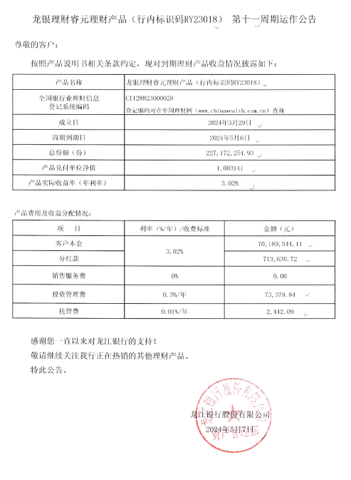 龙银理财睿元理财产品(行内标识码RY23018)第十一周期运作公告