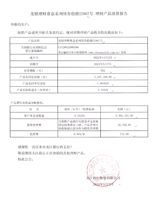 龙银理财睿益系列债券稳健22067号理财产品清算报告