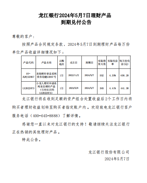 龙江银行2024年5月7日理财产品到期兑付公告
