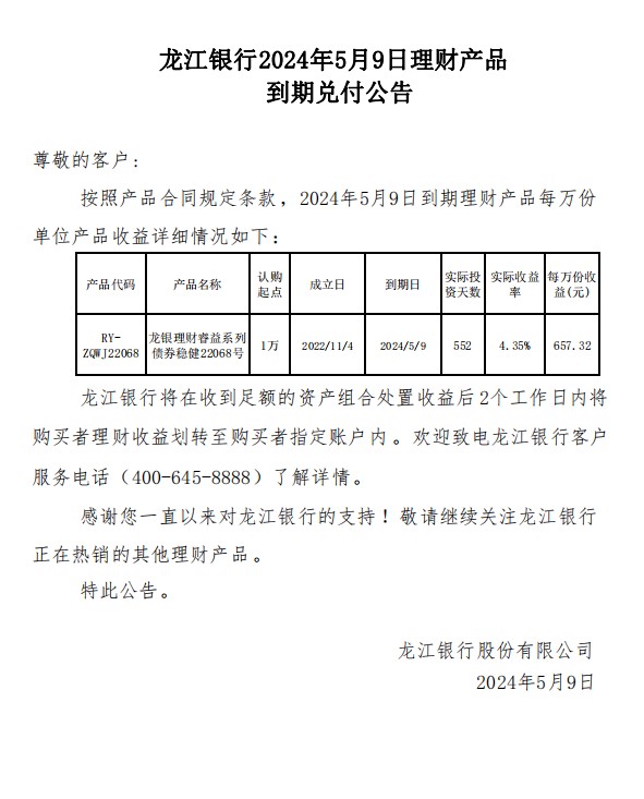 龙江银行2024年5月9日理财产品到期兑付公告