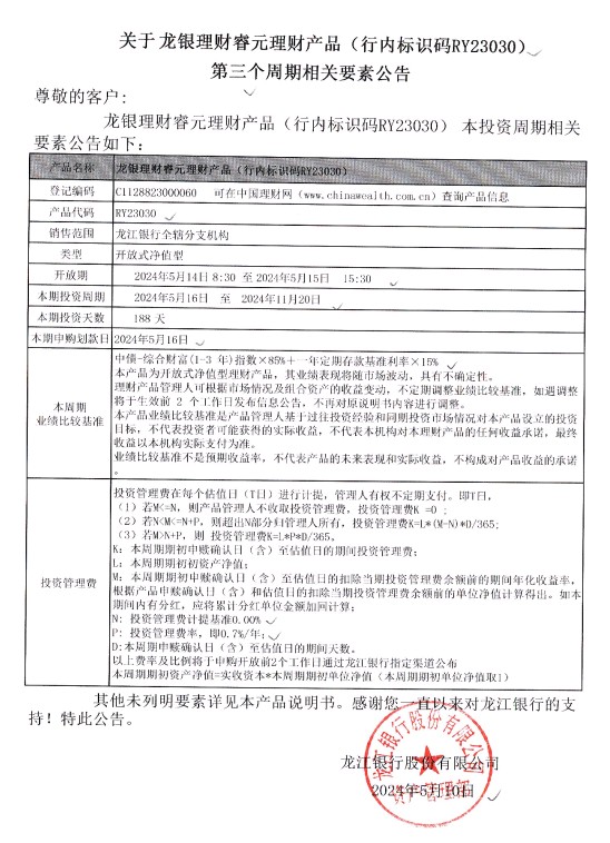 龙银理财睿元理财产品(行内标识码RY23030)第三个周期相关要素公告