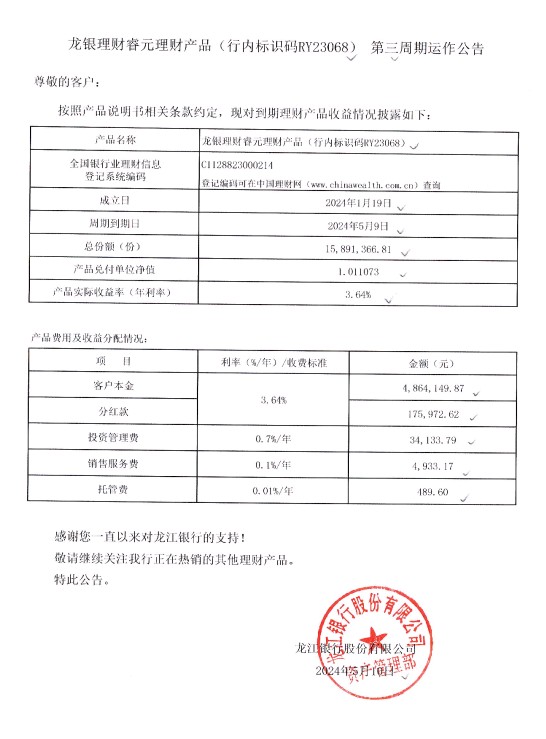 龙银理财睿元理财产品(行内标识码RY23068)第三周期运作公告