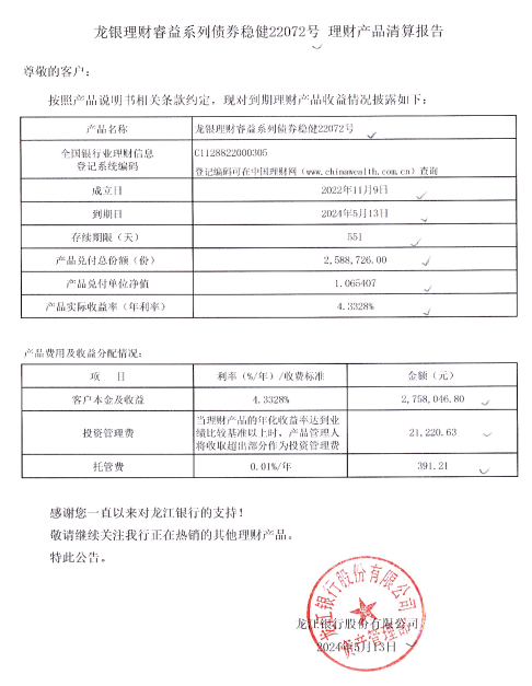 龙银理财睿益系列债券稳健22072号理财产品清算报告