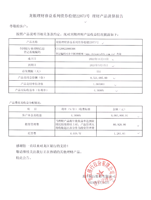 龙银理财睿益系列债券稳健22073号理财产品清算报告