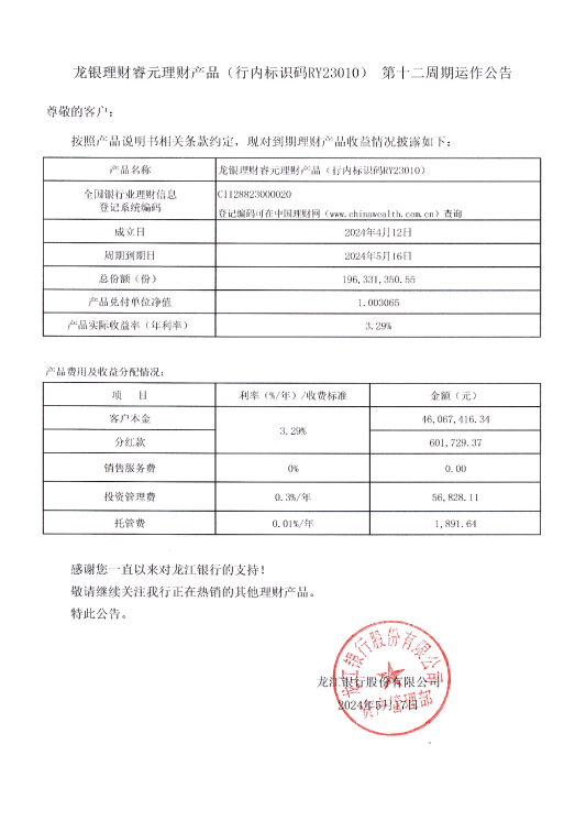 龙银理财睿元理财产品(行内标识码RY23010)第十二周期运作公告