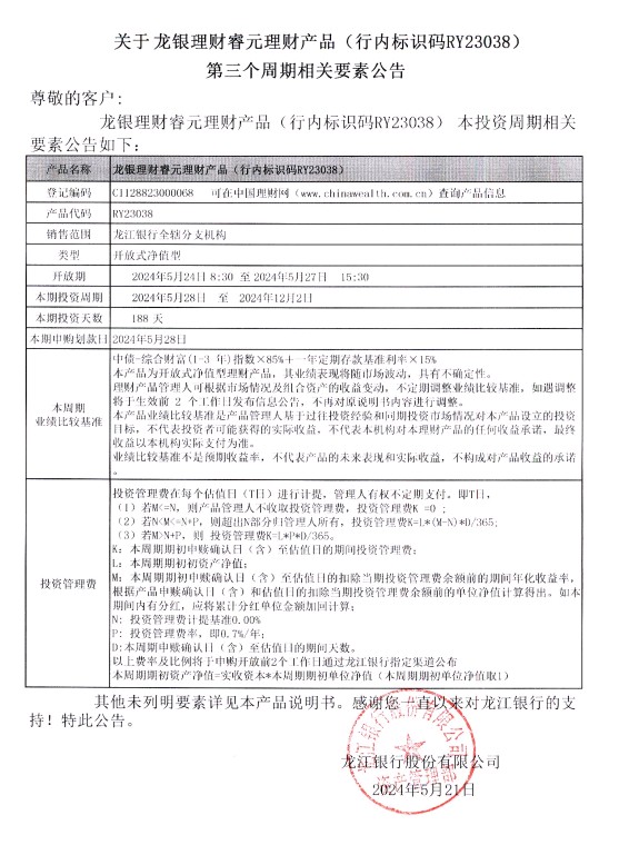 关于龙银理财睿元理财产品(行内标识码RY23038)第三个周期相关要素公告