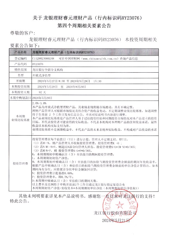 关于龙银理财睿元理财产品(行内标识码RY23076)第四个周期相关要素公告