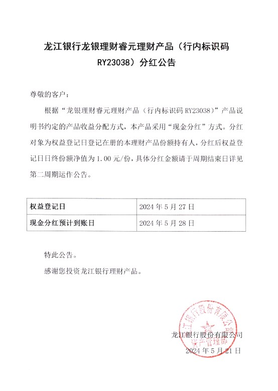 龙江银行龙银理财睿元理财产品(行内标识码RY23038)分红公告