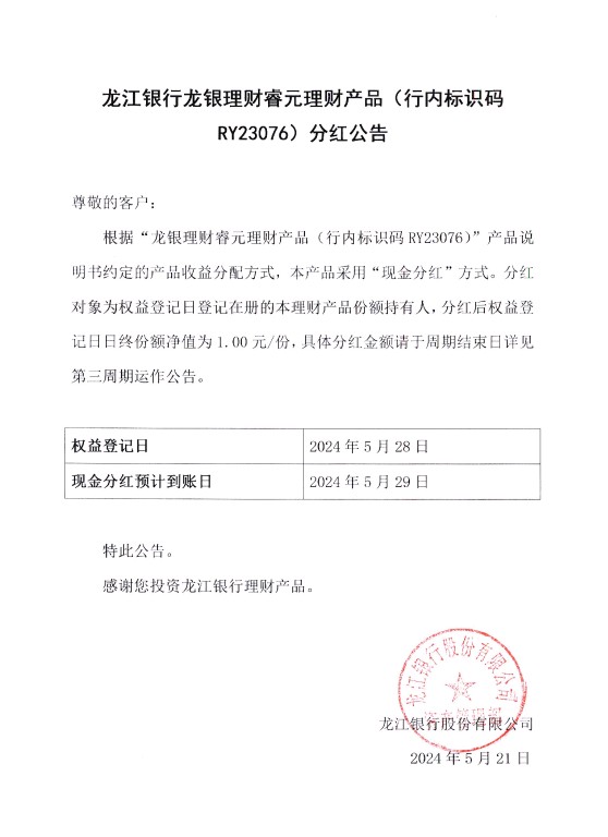 龙江银行龙银理财睿元理财产品(行内标识码RY23076)分红公告