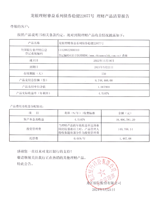 龙银理财睿益系列债券稳健22077号理财产品清算报告