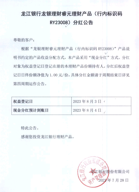 龙江银行龙银理财睿元理财产品(行内标识码RY23008)分红公告