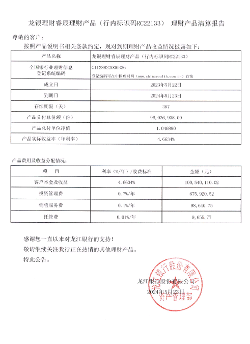 龙银理财睿辰理财产品(行内标识码RC22133)理财产品清算报告