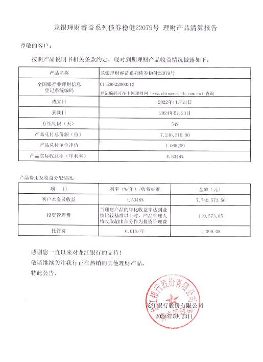 龙银理财睿益系列债券稳健22079号理财产品清算报告