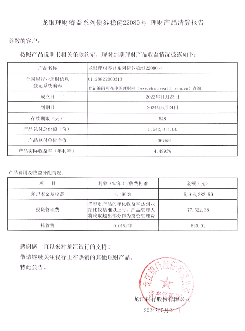 龙银理财睿益系列债券稳健22080号理财产品清算报告