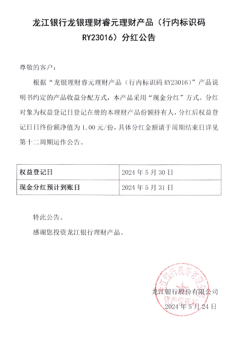 龙江银行龙银理财睿元理财产品(行内标识码RY23016)分红公告