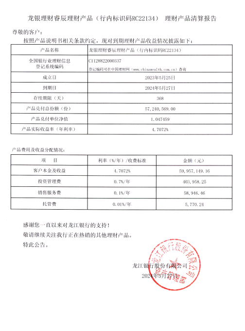 龙银理财睿辰理财产品(行内标识码RC22134)理财产品清算报告