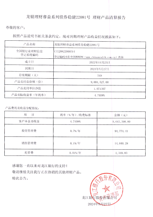 龙银理财睿益系列债券稳健22081号理财产品清算报告