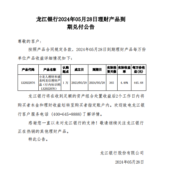 龙江银行2024年05月28日理财产品到期兑付公告