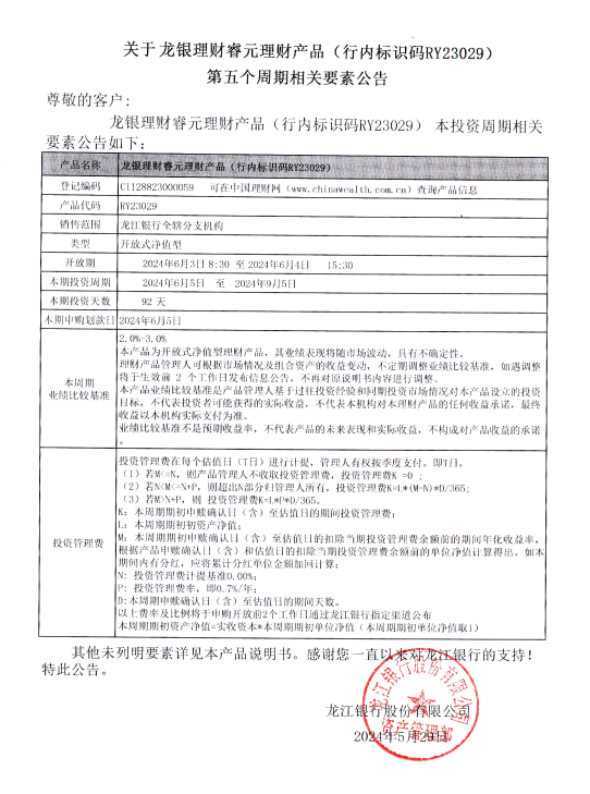 关于龙银理财睿元理财产品(行内标识码RY230219)第五个周期相关要素公告